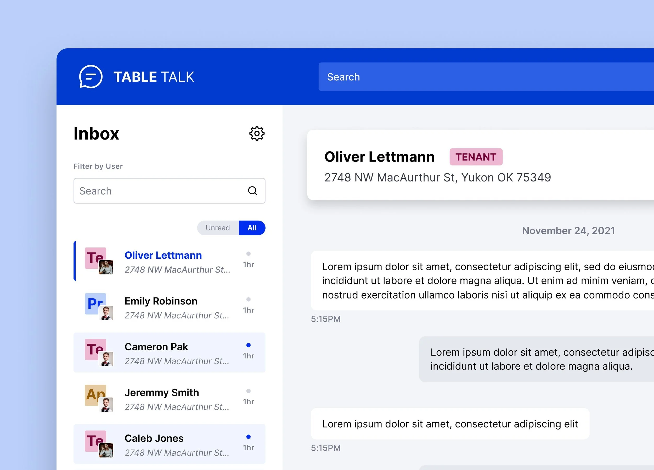 This project delivered a web based application for a property management company in Oklahoma City. Table Talk was designed to provide a workflow specifically for this company to send and receive SMS text messages to/from their tenants.